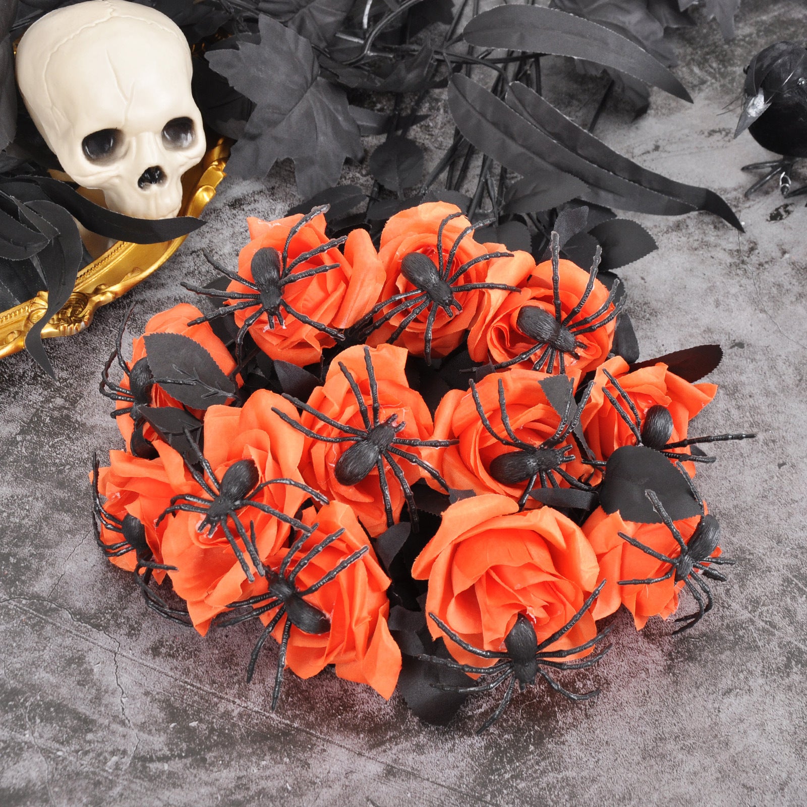Intricate Horror Details: Each stem features a miniature weathered skull nestled among velvet-touch roses, accented by creepy-crawly spiders for a multi-layered scare factor.
